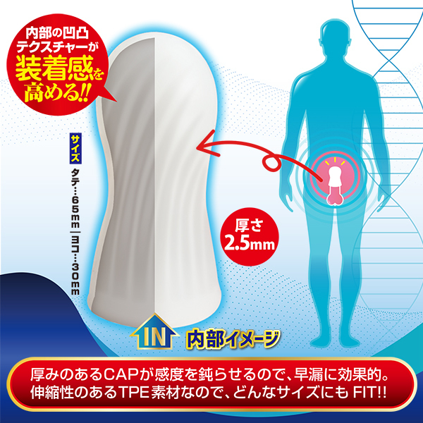 男の強いミカタ。夜のお助けサポートアイテム!!厚みのあるキャップが感度を鈍らせ、持続力マシマシで長期戦もOK。装着方法も簡単。キャップを自身に被せ、その上からコンドームを装着するだけ。フィット感も抜群で、どんなサイズにも対応。いつもより長く楽しみたい方におススメのお手頃キャップです。●TPE素材…伸縮性抜群で、どんなサイズでもぴったりフィット