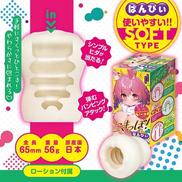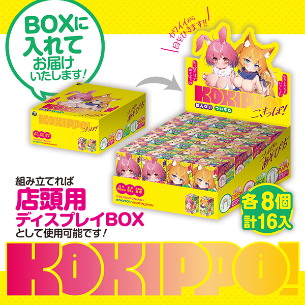 こきっぽ!2種類各8個がオリジナルデザインの箱に入ったBOXセットです。箱を組み立てることでディスプレイBOXとして使用できるので、店頭でのインパクトも抜群です。先っぽコキコキ!先端だけで楽しむミニホール。使い方は簡単。本体にローションを塗り、あなたの先端に被せ、あとはぐるぐるもみもみ自由にシゴくだけ。こきっぽ!本体を突き刺すようにひっぱれば、通常のハンドホールと同じように使用することも出来ちゃう。短い時間でサクッとひとコキ。こきっぽ!で、充実した性活を送ろう。<ばんぴぃ 内部形状>シンプルヒダが、あなたの先端に当たる!弾むように配置されたヒダが、バンピングアタック!<ついすた 内部形状>ツイスト突起で、あなたを誘惑!波打つイボイボのプチプチに、思いっきりダイブ!