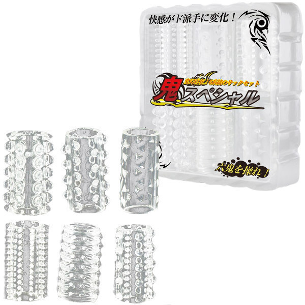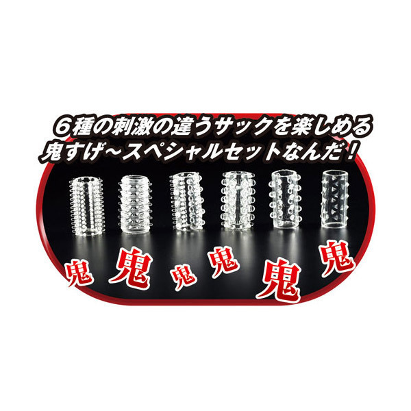 今夜はどれがいい?パートナーと一緒に選んで使って楽しめる、種類豊富なペニスサック「鬼スペシャル」6点セット。異なる形状のハーフサックをその日の気分で使い分けすることができ、6通りもの違った刺激と快感をお楽しみいただけます。もちろん、男性特有のお悩みもしっかりサポート!効果には個人差がありますが、持っていて損はしません。また、バイブやローターに装着すれば楽しみは二倍に!一度は試してみる価値アリの男性補助グッズです。