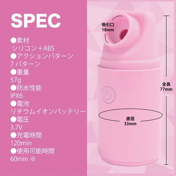 スタイリッシュな見た目で蓋付きだから持ち歩きにも便利な吸引ローター。上質なモーター搭載の吸引機構に高品質シリコン素材の吸引口と持ちやすいサイズ、さらにはIPX6の高レベル防水性能だからしっかり洗えて衛生的です。使用時は蓋を外して底面に付けられます。どこでもキャリー出来る自分だけのプレジャーアイテムです。3.7Vリチウムイオンバッテリー搭載で120分で満充電、最大60分の連続使用が可能です(使用環境により大幅に増減します)。多彩で実用的な7パターンの吸引を演出します。見た目と実用性を兼ね備えたMY PLEASURE GOODSです。●カラー:パープル