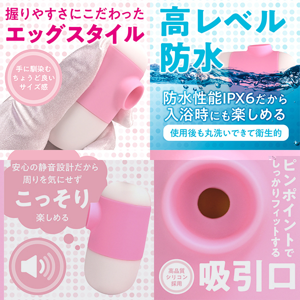 握りやすさにこだわったエッグスタイルの吸引ローターです♪可愛らしいタマゴ型フォルムに、高性能な静音モーターを搭載!上部に配置されたボタンで、片手でも簡単に操作が可能です♪吸引口には柔らかく高品質なシリコン素材を使用し、しっかりとフィットして快適な真空状態を実現!7パターンの吸引アクションを搭載しており、強弱の調整も自由自在です♪120分で満充電でき、最大90分の連続使用が可能!(使用環境により変動します!)さらにIPX6相当の防水設計だから、水洗いもできて清潔に保てます♪手軽さと高性能を兼ね備えた、使いやすさ抜群のアイテムです!