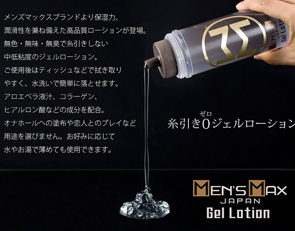<MEN'S MAX>糸引きゼロで即拭き取り可!メンズマックスの高品質ジェルローション。●スタンダードな中高粘度●拭き取り簡単ジェルタイプ●高い潤滑力ながら糸引きなし●使いやすい無色・無味・無臭●お肌に優しい天然成分配合●内容量360ml入り。浮かび上がる金のロゴが印象的なメンズマックスのジェルローション!ジェルタイプはティッシュ等でも拭き取れて簡単に洗い流せるので、オナホールへの使用に最適!アロエベラ液汁・コラーゲン・ヒアルロン酸など、お肌に嬉しい成分も配合されています。