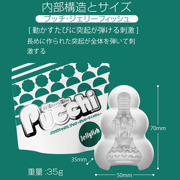 全てが新しくなったプッチ。ポケットサイズのローション不要ホールプッチシリーズが生まれ変わって新登場。軟性素材から内部の構造、パッケージ、全てが新しくなりました。デコボコ感、さらにクッキリ。今回新たに導入した「HD(High Definition)成形」で突起のデコボコ感がさらにクッキリになりました。突起に触れたときの粒立ちが違います。弾力感、さらにモッチリ。「HD 成形」により軟性樹脂の弾力性も向上。さらにモッチモチに、しなやかな素材になりました。内部構造も、さらにハッキリ。オリジナルシリーズ、スイーツシリーズ計8種類の内部構造をより精密な造形にリニューアル。「HD 成形」とあいまってデコボコ感がよりハッキリわかる構造になりました。生産工場を一新。新型プッチシリーズは日本国内に新設した工場から生産。最新の設備と厳密な品質管理で一つ一つ丁寧に作ります。ローション不要、必要なのは水だけ。ローション不要軟性素材「プラスウェッチ」水分が付着すると潤い成分が反応、ねっとりした潤いに包まれます。<ジェリーフィッシュ内部構造>「動かすたびに突起が弾ける刺激」長めに作られた突起が全体を弾いて刺激する