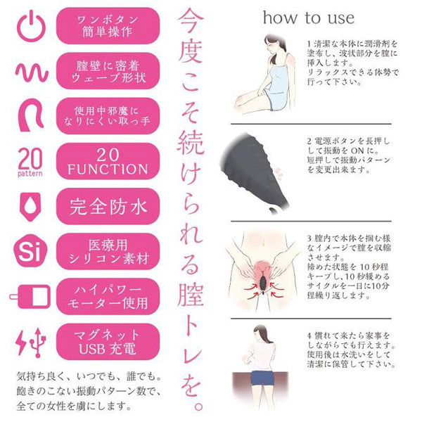 いつでも誰でも、ずっと気持ちイイ♪膣圧を向上して『極上名器』に変身させる膣トレグッズ「ウェービーオルガ ホワイト」。膣壁に密着するウェーブ形状のデコボコした表面の構造が、男性を虜にする名器に変身させます。こまめに挿入してトレーニングすることで徐々に膣圧アップ!取り出しやすいスマートな取っ手は邪魔にならないので、普段の生活をしながらでもトレーニング可能。強さが選べる20種類もの振動パターンを搭載!ボタン一つの簡単操作で異なる刺激を堪能できます。また、トレーニングだけでなくクリバイブとしても快感を得られるハイパワーモーター仕様です。本体の充電は簡単なマグネット式USB充電(専用ケーブル付属)、完全防水仕様、医療用シリコン製。