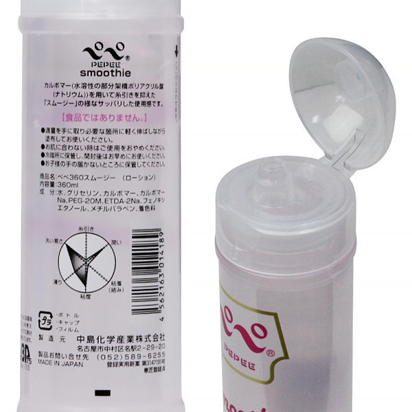 ローション特有の糸引きが苦手な方にとっての救世主!「ペペ 360 スムージー」。カルボマー(水溶性の部分架橋ポリアクリル酸ナトリウム)を用いているため、まるでスムージーのようなさっぱりとした使い心地を実現♪糸引きを抑えた「スムージー」の様なさっぱりした使用感で、滑りだけが欲しいというときに活躍してくれます。繊細な構造のオナホにもどうぞ♪【成分】水・グリセリン・カルボマー・カルボマーNa・PEG−20M・ETDA−2Na・フェノキシエタノール・メチルパラベン・着色料。