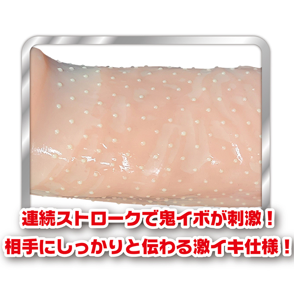 表面は連続したツブが展開。まるでサックを付けているような感触です。今までにない連続鬼イボを纏いパワーアップ!連続鬼ストロークで超刺激&快感…激イキ必至!前作よりも大きくなったイボが相手にしっかりと伝わる激イボ仕様。さらにズレにくい構造でプレイ中も安心です。