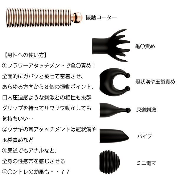 【男女兼用バイブセット】小さいのにパワフル!10種類振動×5つの付属アタッチメントを全身くまなく責めまくる!想像を超える組み合わせは一人でもパートナーと一緒でも使えてコスパ最高。初心者から上級者、ノーマルからSMまで幅広いニーズに対応アイテム。一つだけじゃ足りないかも?二色揃って使うのもオススメ。【女性への使い方】定番で誰でも愛される電マから敏感なところに振動刺激を〜多彩な形を自由自在に組み合わせ出来ちゃう豊富な仕様!素材はスベスベ滑らか感触で安心。@電マで全身を刺激!Aフラワーアタッチメント−乳首責めBクリ責めアタッチメントCリップスティックローターD全身ロータープレイなど楽しみ方色々。【男性への使い方】@フラワーアタッチメントで亀〇責め!全面的にガバッと被せて密着させ、あらゆる方向から8個の振動ポイント、口内圧迫感ような刺激との相性も抜群。グリップを持ってサワサワ動かしても気持ちいい…Aウサギの耳アタッチメントは冠状溝や玉袋責めなど。B尿道でもアナルなど、全身の性感帯を感じさせる。C〇ントレの効果も…?【コンパクトサイズ+万人向け】指一本の大きさ携帯便利!変えやすいアタッチメント。一回の充電は一時間たっぷり使える。直接肌に触れるものだから、さらさらすべすべの高品質シリコン使用しています。最新のusbマグネット充電!生活防水仕様となっているので、お風呂やプールなどの水場で楽しんだり、使った後は水洗いしてお手入れすることができます!また次も安心して楽しむことができるのも魅力です!カラー:ブラック●生活防水(IPX4)●10段階振動●医療用シリコン素材、ABS●USBマグネット充電●充電時間:80分、稼働時間:60分●電池容量:180mah※こちらの商品は受注発注商品の為、ご注文から発送までに3、4営業日掛かる場合が御座います。