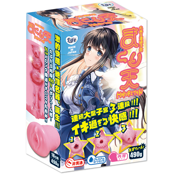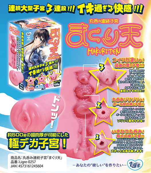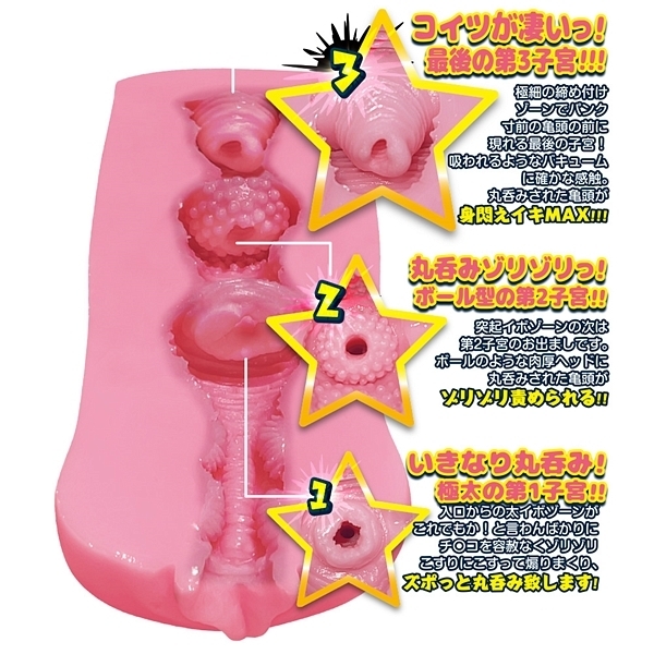 3つの子宮が亀頭を丸呑みする3連続のフィニッシュゾーンが自慢の非貫通オナホ「丸呑み連続子宮 まくり天」です♪約500gの超肉厚ボリュームボディに包まれての前半の刺激から後半の刺激、疑似子宮と最高のキュポ感は絶品!極デカの子宮に亀頭をパクッと丸呑みされたような重厚な快感♪入り口からの太イボゾーンでゾリゾリ擦られたあとは極太子宮でパックンチョ!さらには突起イボゾーンに第二の子宮♪肉厚ヘッド子宮で丸呑みゾリゾリ!王道な筒型フォルムで扱いやすく、ロング触手や半円型のコブが心地よいズリ感で刺激♪その後は極細締め付けゾーンを通り第三の子宮へ!確かな感触に吸われるようなバキューム子宮の快感!これら三つの連続子宮をストロークで超えていく度に身体中が震えるような快感を味わえます♪怒涛のカリ刺激と肉厚で包み込まれるような快感をぜひお楽しみください。