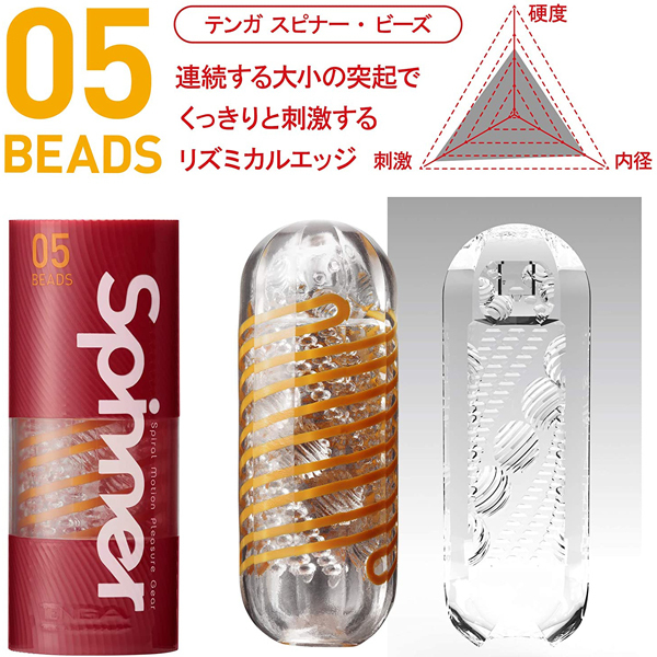 上下運動に連動してスピンする「TENGA SPINNER」に、伸縮性を高め、強力回転を生み出した新作が登場!05ビーズは、渦を巻くように配置された大小の突起がリズミカルに刺激するスパイラル構造。付属品に、大好評「TENGA HOLE LOTION」シリーズの「リアル」使い切りローションが同梱!洗って繰り返し使えるお洒落なテンガをぜひご自宅でお楽しみ下さい。