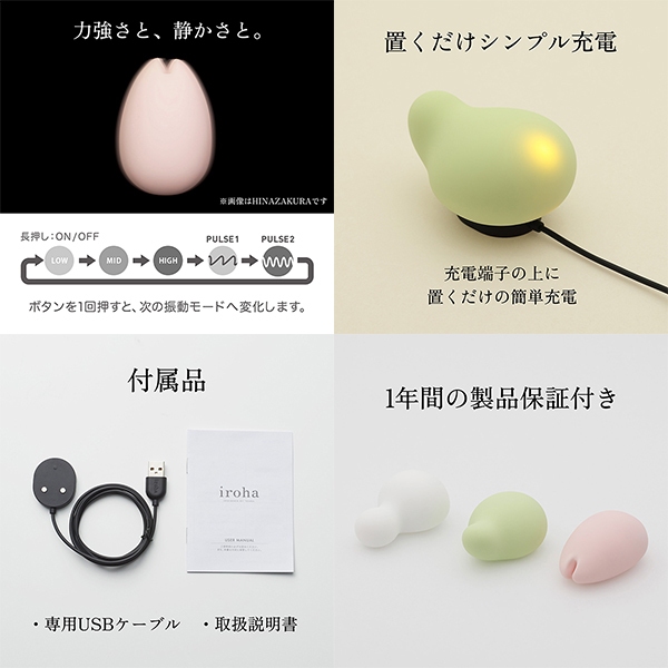 晴れ晴れと、気持ちよく。体へのあたりがやさしい、ふんわりソフトな肌ざわりが好評のセルフプレジャー・アイテムirohaがリニューアル。驚きの静音設計と、シンプルで使いやすい機能設計はそのままに、形状やボタン設計を見直し、リズムパターンを1種類追加しました。今までよりもさらに使いやすくなったirohaは、これからも、すべての女性に気持ちよさを届けます。新しくなったirohaで、晴れやかなセルフプレジャーを、ご体感ください。振動を楽しむのに加えて、全体をあてがったり、先端部で振動を楽しむことができます。はなみどり