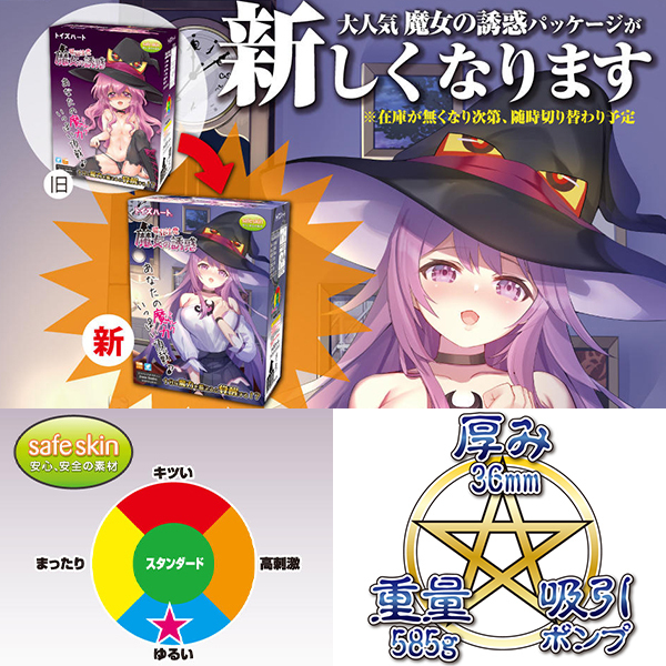 トイズハートのオナホール「ハッピネス」の復刻版として登場した「吸引注意 魔女の誘惑」。大きめサイズの本体は、ベタつかないセーフスキン素材を使用した柔らか感触。広めの内部は絡みつきながら包み込む複雑なヒダ構造!締まった中間部がストロークの度にコリコリと刺激を与えます。さらに、イボを配置した最奥のバキュームエリアで、吸いつきによる超絶刺激も楽しめます。