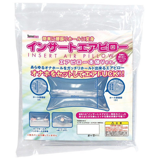 お手持ちのオナホールをセットするだけで、簡単に腰振りオナニーが出来るタマトイズのエアピロー。●大小二つの挿入穴を本体上下に配置●本体サイズ:55cm×35cm●ホール装着穴(大):8.5cm●ホール装着穴(小):5.5cm●保管にも便利なコンパクトタイプ。カップホールやハンドホールなど様々なサイズに対応可能。別売りの「インサートエアピロー用枕カバー」を装着すれば、二次元嫁とのリアルな疑似H体験が楽しめます。●メーカー型番:TAMS-011※オナホール、枕カバーは付属しておりません