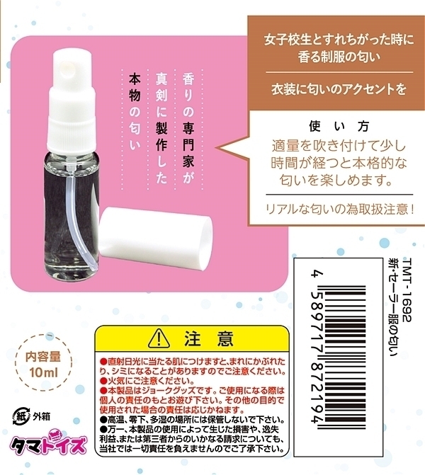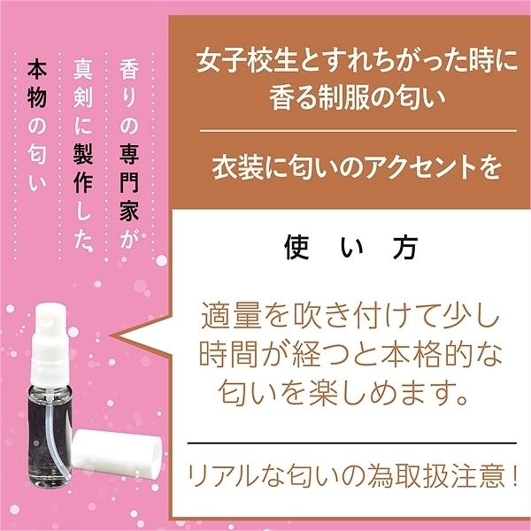 新製法エタノールフリー。女子校生の汗とフェロモンが混ざった芳しき香りは女子校生とすれちがった時に香る制服の匂い。思春期の淡い想いがよみがえる。女子校生のフェロモンたっぷりのいい匂い、匂いで感じる新感覚!あのとき感じたあの匂いをもう一度。女性の特有の匂いを詰め込んだ香りグッツは衣装に匂いのアクセントを。