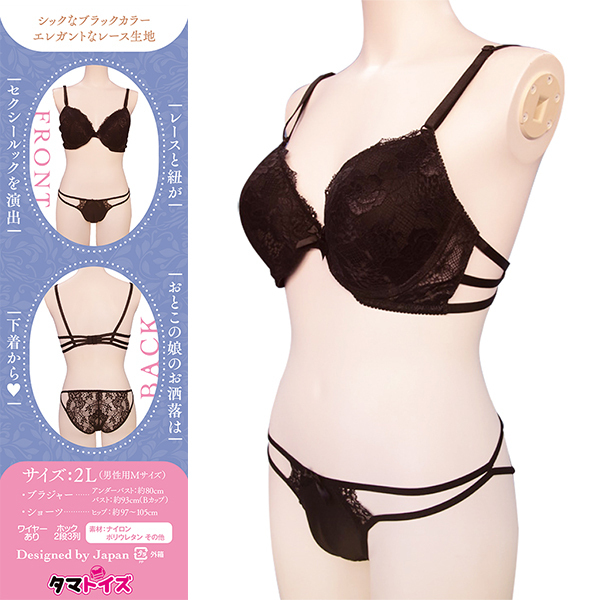 おとこの娘専用デザインの本格ブラ&ショーツセットが登場♪下着から可愛くお洒落を楽しみたいあなたへ!股間にはワレメカップ付きで、綺麗なくっきり一本筋をリアルに再現♪ショーツの食い込み面はパッドでしっかり成形、魅惑のキャメルトゥを演出します!ヒップはシースルーレースで大胆セクシーなハーフバック仕様♪ブラはワイヤー&着脱可能パッド入りで胸元をふっくらボリュームアップ!レースと紐が絡み合うセクシールックは、可愛いのに着け心地も快適です♪おとこの娘にぴったりの2Lサイズ(男性用M相当)でフィット感抜群!胸囲約93cm、ヒップ97〜105cm対応で美しいシルエットに♪こだわりの日本デザインで、おとこの娘ライフを華やかに演出します!●TMT-1817