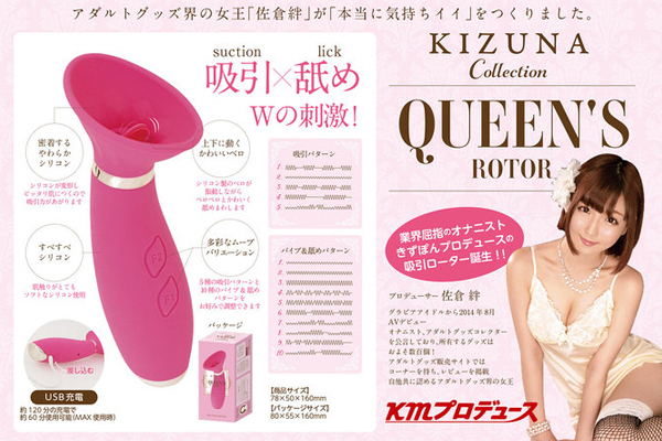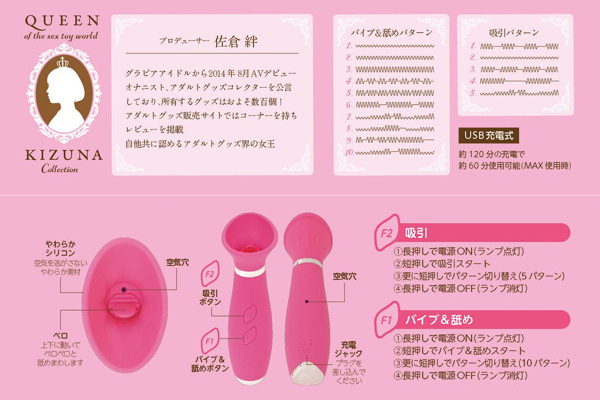 アダルトグッズコレクター、きずぽんこと元AV女優「佐倉絆」がプロデュース♪バキューム&舐めの2つの刺激を体感できるUSB充電式の可愛い吸引ローター。密着度抜群!肌触りの良いシリコンボディの吸引部には、ペロペロと上下運動する舌を設置♪5種類の吸引刺激×10種類の振動と舐め刺激で「本当に気持ちいい」を実現!120分の充電で最大60分稼働可能、生活防水製