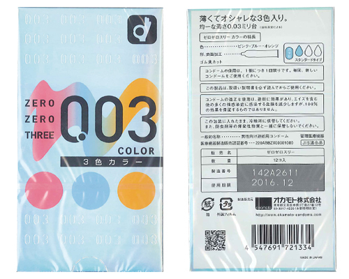 HOME> コンドーム > 薄い・厚い > オカモト ゼロゼロスリー003 (3色カラー)