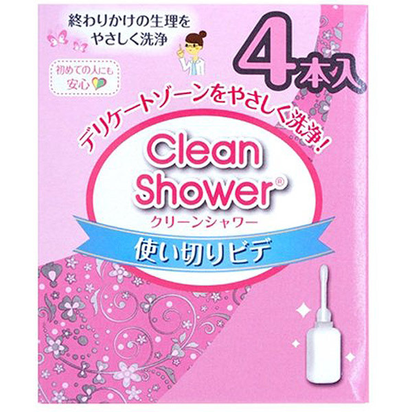デリケート部分を優しく洗浄!初めての方にも安心してお使いいただける、携帯に便利な使い切りビデ「クリーンシャワー」(4本入り)です。挿入部はソフト素材の丸い形状になっており、体にかかる負担を軽減。生理の終わりかけやオリモノの多い日を始め、ラブタイム前やプール&海水浴後の洗浄をトイレやお風呂場で済ますことができます。週2、3本を目安に無理のないご使用を。