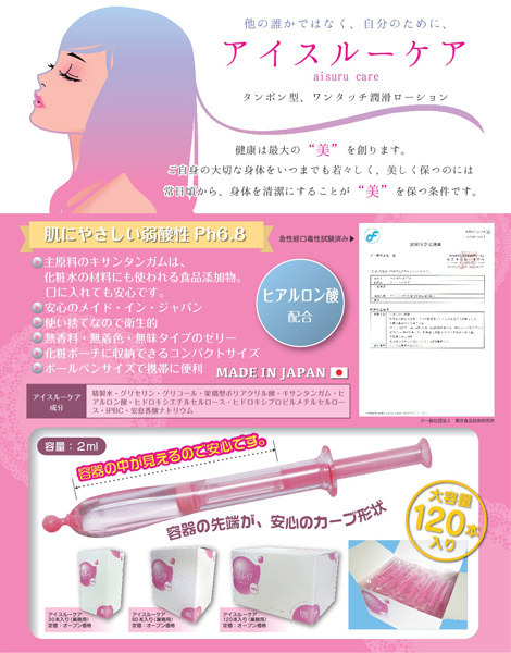 まとめ買いにも便利な業務用60本入り!潤い不足で悩む女性の為の潤滑ローション「アイスルーケア」。●ワンタッチで注入できる注射器タイプ●一回使い切りの個包装で衛生的●自然に潤う無香料・無着色●身体にやさしい成分を配合した弱酸性。注射器型のプラスチック容器だから、手を汚さず注入出来てとっても衛生的!口に入っても大丈夫な無味無臭なので、安心してお使い頂ける日本製の潤滑ゼリーです。