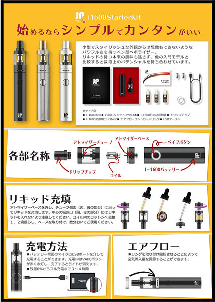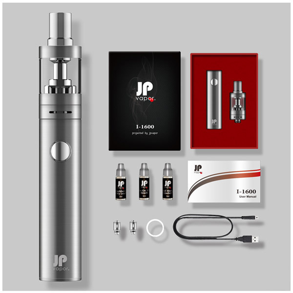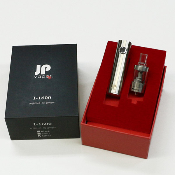 快適なVAPE(ベイプ)ライフをすぐに始められる特製BOX入りのフルセット!電子タバコのペン型ヴェポライザー「JPvapor I-1600 スターターキット シルバー」。小型でスタイリッシュな外観からは想像もできないようなパワフルさを持つペン型ベポライザー。リキッドの持つ本来の風味も逃さず、他の入門モデルと比較すると数段上のポテンシャルを持ち合わせています。