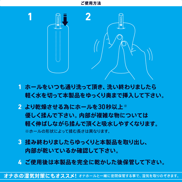オナホを洗った後に挿しこんで揉むだけで速乾燥。『G PROJECT HOLE QUICK DRY 珪藻土STICK』は、挿し込んだ瞬間から棒状の珪藻土が水をしっかり吸収して乾燥させる!今まで奥の乾燥が難しかった大型ホールにも対応していて、オナホと一緒に密封保管する事で、湿気を取り除いてくれたりといった効果も期待できます。驚きの吸水力と速乾力に優れた本製品を是非お試しください!
