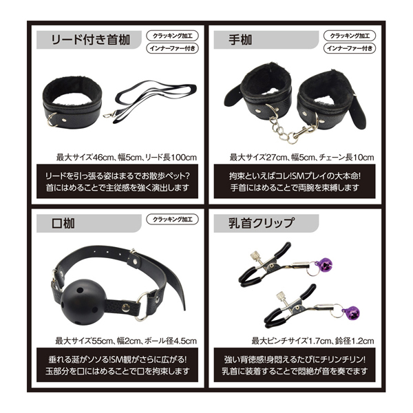 好きなあの子をいいなりに……。これひとつでSMプレイを網羅する豪華8点セット「SM∞」!SMプレイに興味があるビギナーなアナタにぴったりなSMグッズセットです。ペットのような主従感の「リード付き首枷」、本格拘束仕様の「手枷」、移動も束縛する「足枷」、暗闇が緊張感を強める「アイマスク」、垂れる涎がソソる「口枷」、悶絶で音を奏でる「乳首クリップ」、奥深さを感じる「SMロープ」、SMの代名詞「バラムチ」。全8アイテムに加え、SMロープ用の「緊縛指南書」も付いています。「首枷」「手枷」「足枷」には、装着者を傷つけないよう内側にクッションの付いた「インナーファー」仕様。革素材は、風合いがとってもオシャレなクラッキングレザー加工です。