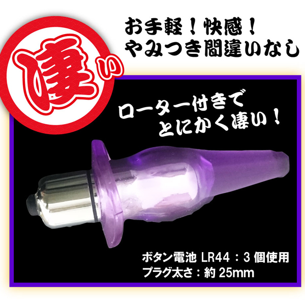 コンパクトなのでお手軽で快感なア○ル用プラグ。突き刺さるおもてなし。ローター付きでとにかく凄い。ボタン電池3個、交換可能。色:紫