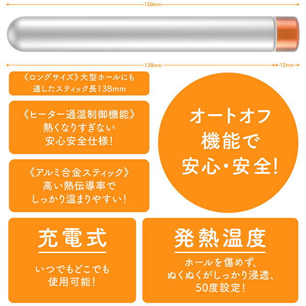 寒い時季もこれで安心!大型ホールにも使える13.8cm長のオナホウォーマーです。使い方は簡単でオナホに挿すだけで楽チンぬくぬくオナニー!充電式でケーブルレスだからいつでもどこでも使用可能♪ホールサイズに合わせて温め時間を15分と10分の2段階で設定可能でオートオフ機能を搭載しているから点けっぱなしの心配がありません!さらには完全防水だからホールに注入したローションも一緒に温めることができ、そのまま洗えるのでメンテナンスも楽チン♪発熱温度は50度設定!ホールを痛めることなくぬくぬくがしっかりと浸透します。高い熱伝導率で深く浸透して温まりやすいアルミ合金スティック製。充電時間は約180分で稼働時間は15分モードで約2回、10分モードで約3回。※ホールの質感・15分を越える連続使用により、ホールの構造に支障をきたす場合がございますのでご注意ください。付属品はUSBマグネット式充電コード。
