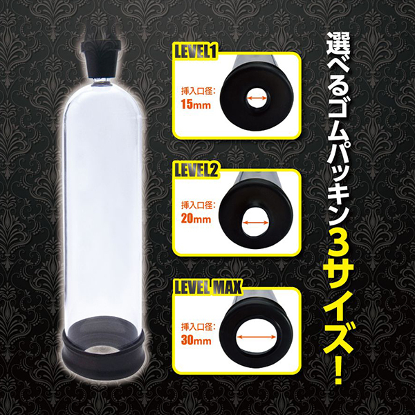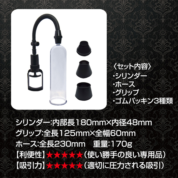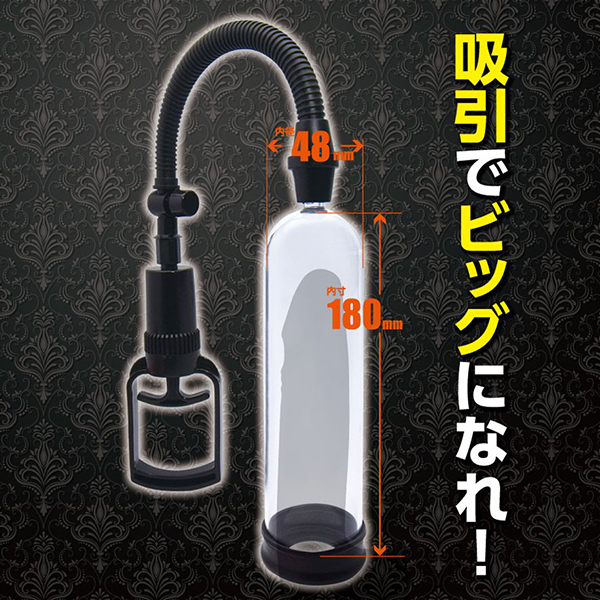 吸引でビッグになれ!強い男になるために開発された増大ポンプ「BIGBOY PUMP(ビッグボーイポンプ)」が新登場!簡単に片手で握れるトリガーレバーにワンプッシュの圧力開放ボタン、さらには大きさが目で分かる透明シリンダー、サイズが選べる3種類のゴムパッキンと操作性や視認性も抜群♪必要なものがすべて揃っていて、あとはレバーを握って空気を吸って、吸引圧力でメンズをビッグにするだけ!トリガーレバーは手動式なので微細な調整もコントロールも簡単♪圧力開放ボタンは安心設計でワンプッシュで吸引キャンセル!シリンダーは憧れサイズにぴったりな内寸長180ミリ×内径48ミリとなっています。挿入口のゴムパッキンは、選べる3サイズ(15ミリ、20ミリ、30ミリ)!シンプルながらもじっくり増大を計画しているならおすすめです♪