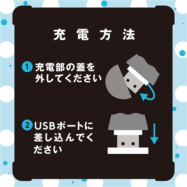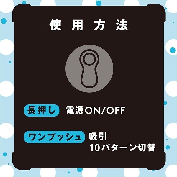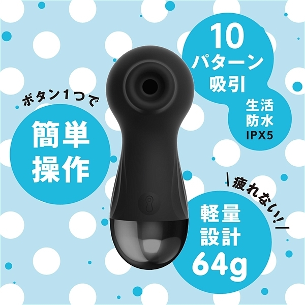 「はじめて」の人に選んでほしい。コンパクトボディでもしっかりイケる、強力吸引10パターン。手が疲れない軽量設計64g。ボタン一つで簡単操作。USBポートに差し込むだけのラクラク充電。生活防水IPX5。●カラー:ブラック