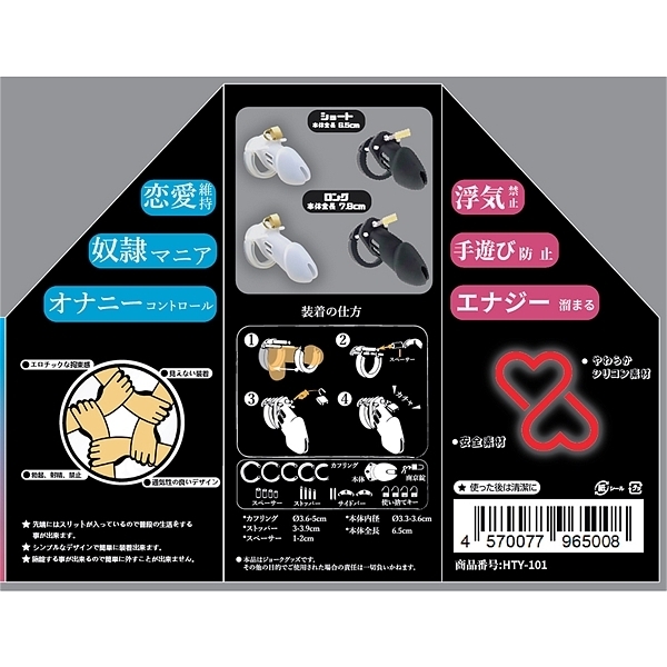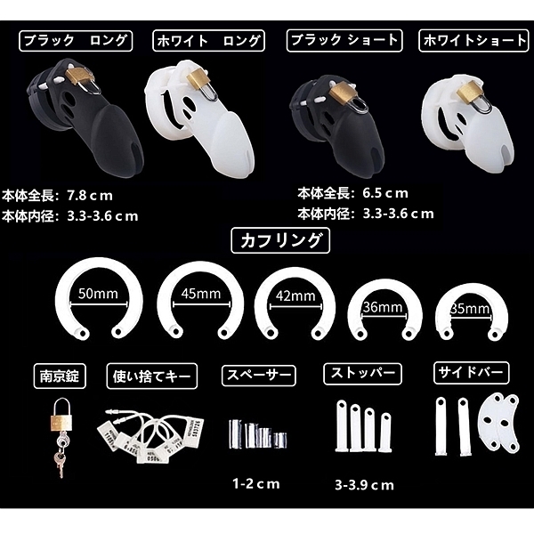 各部品を組み立てることで、あらゆるサイズに適した貞操帯が出来ます。先端に排泄口があるので装着中も排尿が出来ます。南京錠をすることで射●管理を確実に行うことが出来ます。ショート・ホワイト