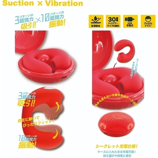 3種の吸引パターンに10種のバイブレーションを搭載した吸引バイブ。30種類から選べる豪華なW刺激。吸引は強力で吸い付き抜群。10種の振動は弱いから超強力まで様々。女性のために考えられた吸引バイブで本当の快感を体験。フレキシブルに動かすことのできる本体はピッタリ”フィットが出来るように角度調節が自由自在。「あたらない」が無いようにしっかり設計されています。ナカイキのみ、ク●イキのみでも使用可能。2点攻めでナカとク●トリスのWイキも体験してください。充電ができる収納ケースを採用。充電中に本体が露出しないようにひと工夫しました。ケースにしまって充電すれば何を充電しているかわからないし衛生的です。ケースにいれれば持ち運び、収納も便利。パワフルなのに静音設計なのでお隣さんが気にならない。水洗いOKの生活防水仕様!高品質シリコンを採用しスベスベな肌触り。連続時間約120分と長時間使用可能。