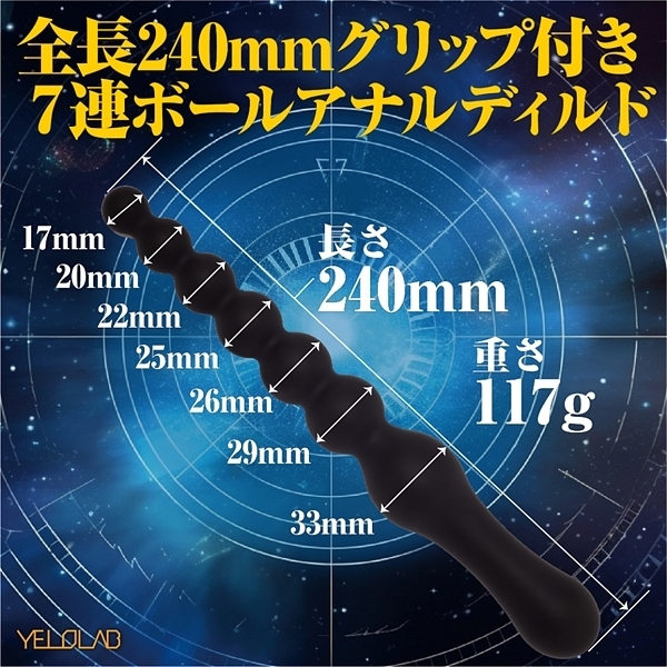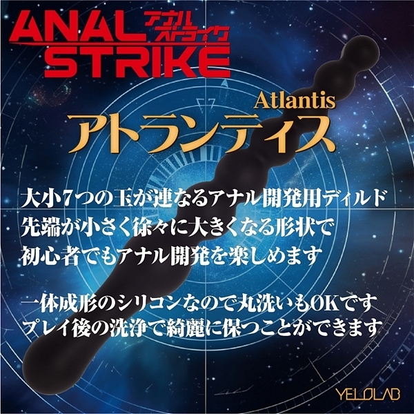 手触りが絹のように滑らかな高品質プレミアムシリコン製【ア●ルストライクシリーズ】アトランティスの登場です。全長240MMで大小7つの玉が連なるアナル開発用ディルド。先端が小さく徐々に大きくなる形状は自分やパートナーの限界を知る為の形状で、初心者から上級者までアナル開発を楽しむことができます。ボール間の滑らかな継ぎ目はしっかりとローションをキープする滑らかさ。初心者でもスムーズな挿入をサポートし、手持ちグリップでしっかりと満足させます。最後まで挿入して少しづつ引き抜く時の刺激は新しい絶頂体験を味わえます。一体成型の高品質プレミアムシリコンなので丸洗いもOKです。プレイ後の洗浄で綺麗に保つことができます。初心者から玄人まで幅広くお楽しみいただけます。※本商品はジョークグッズですので、その他の目的でご使用された場合の責任は一切負いません。