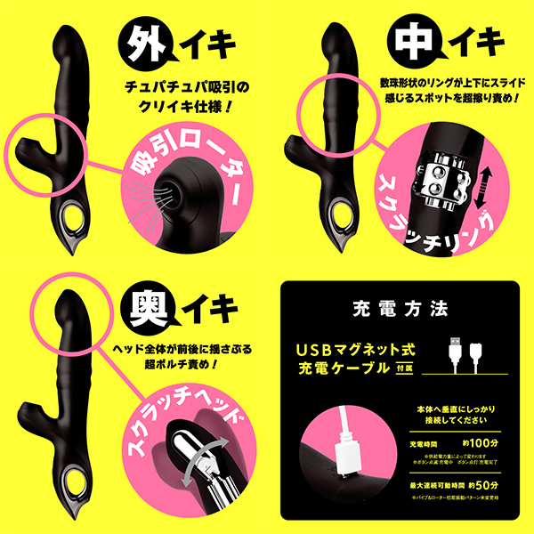 気持ちイイとこ全部責め♪究極ギミック搭載で奥イキ・中イキ・外イキ革命!ヘッドが前後に揺さぶり超ポルチ責めするスクラッチヘッドギミック!数珠形状のリングが上下にスライドし、感じるスポットを超擦り責めするスクラッチリングギミック!チュパチュパ吸引でクリイキ仕様の吸引ローター!バイブ振動10種類に吸引ローター10種類、ギミックパターンが5種類で脅威の全500バリエーションで楽しめます。超強力重厚モーター で芯から震える重くて強烈な振動!肌ざわりなめらかな高品質ソフトシリコン仕様です。本体は充電式なのでエコに使用可能。本体:充電時間約100分※本体:最大連続稼働時間約50分(初期振動パターン未変更時)_IPX6等級_バイブ・ローター各10パターン振動_ギミック5パターン可動_付属品:USBマグネット式充電ケーブル※IPX6:放水ノズルを使って噴流水を最低3分間あてる試験(浸水は不可となります)●カラー:ブラック