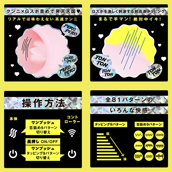 Gスポ覚醒!高速タッピング!超!愛を感じる舐め×手マンバイブ!トントンとGスポを刺激する高速タッピング機能はまるで手マンされているかのような極上快感!スベスベの舌で舐め上げるクンニはリアルでは味わえない超高速舌技!クンニ×Gスポ責めでたまらない快感_遠隔操作コントローラー付きなので、手放しでも楽しめます!中イキ開発にもオススメです_敏感な部分に直接触れるものだから、ぷにっとソフトな素材を使用しました。タッピング9パターン&舌舐め9パターン。完全防水IPX7等級&充電用USBケーブル付属&遠隔操作コントローラー付き●カラー:pink
