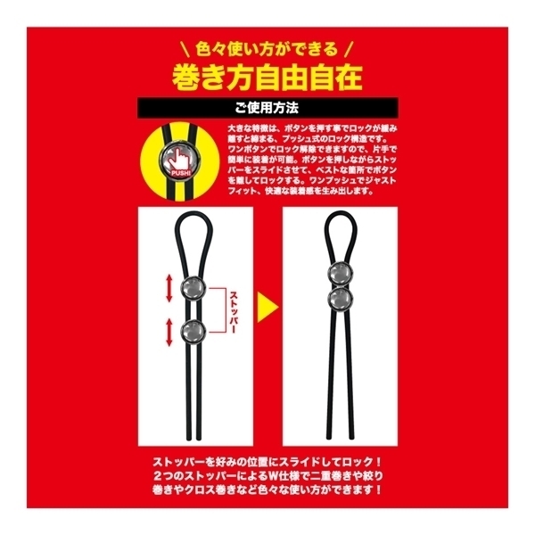 押すと緩み、離すと締まる押しボタン式ロックが特徴♪ワンプッシュで簡単にサイズ調整ができ、しっかり固定!ストッパー付きで二重巻きなども可能です♪高伸縮で肌触りの良いシリコン素材を採用し、快適な使用感を実現!高伸縮でさわり心地の良いシリコン素材を採用。これで貴方も快適に、スーパーなメンズスタイルを楽しめます!