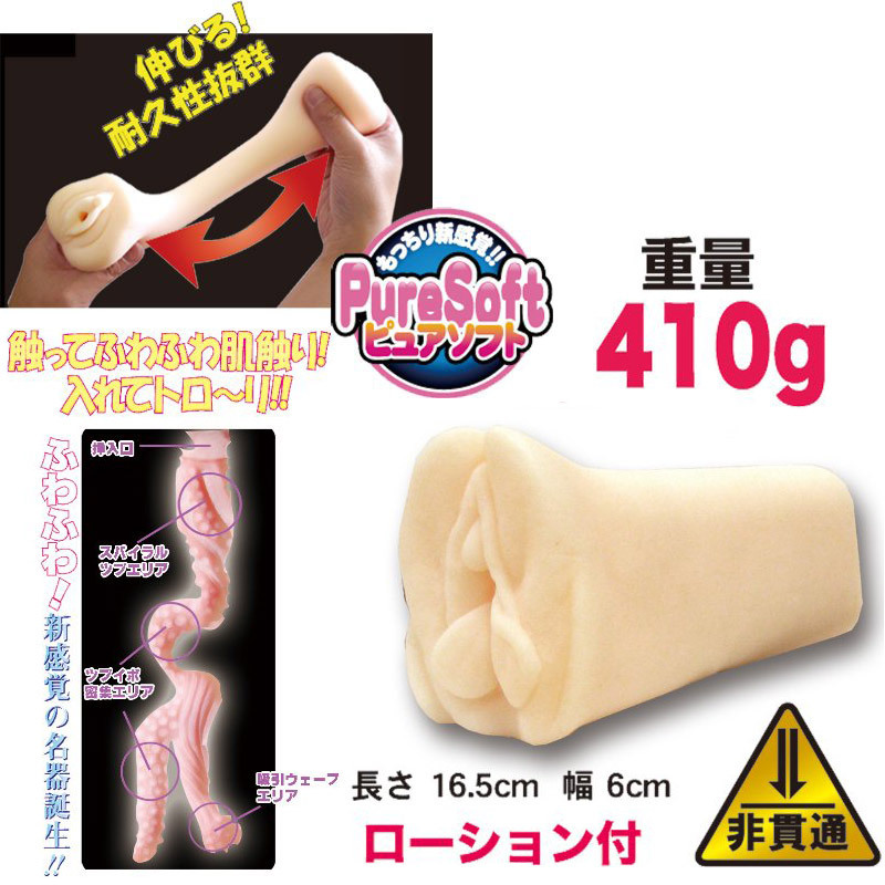 ふんわりトロトロの新しいもっちり感触!マッタリ系オナホール(非貫通型)。新素材のピュアソフトを採用した超柔らか素材。無次元加工のもっちり挿入口から、肉をかき分けて進入するリアルな挿入感!内部はスパイラルのツブツブが続き、最奥はツブイボ密集エリアと吸引ウェーブエリアの2種類が楽しめる構造のオナホールです。